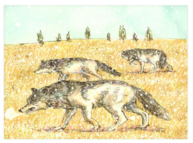 새끼 늑대를 안고 소녀는 거센 눈발을 헤치고 늑대 울음소리가 들리는 깊은 산 쪽으로 걸어간다.