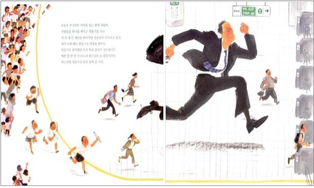 지난해 1월 출간된 <내일은 맑겠습니다>는 한 주의 날씨를 알리는 음성으로 시작돼, 노란 선을 따라 사람들의 하루를 그린다. 버스정류장을 이루던 노란 선은 횡단보도가 됐다가, 땅 밑과 물 속을 지나 공중으로 이어진다.
