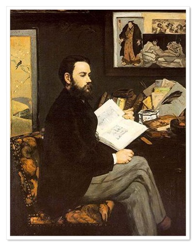 위 그림은 마네가 감사의 표시로 그려준 졸라의 초상화입니다. 뒤에 ‘올랭피아’ 그림이 보이죠?