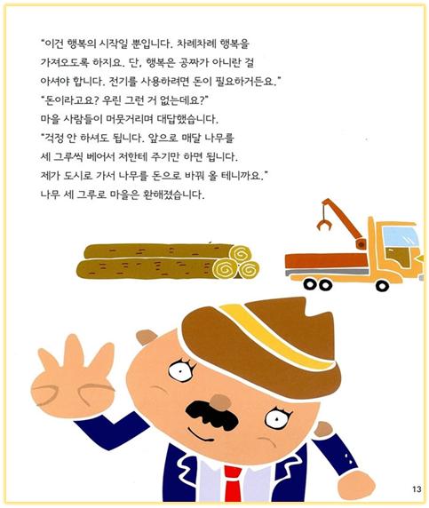 이들은 행복을 전해주겠다며 전기, 텔레비전 등을 소개한다. 마을 사람들은 밤을 밝히는 전기, 세상의 벌어지는 일을 알게 해주는 텔레비전을 갖고 싶어 마을의 나무들과 교환을 한다.