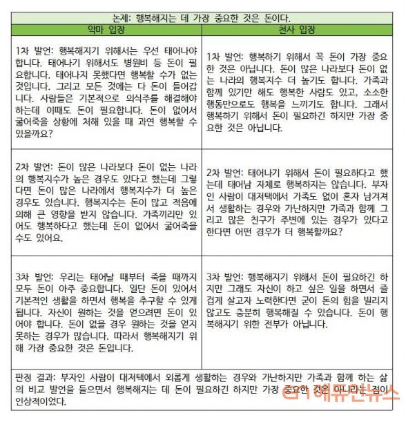 토론 전 활동을 하고 난 후 ‘행복해지는데 가장 중요한 것은 돈일까?’ 주제로 두 마음(천사-악마) 토론을 실시했다.